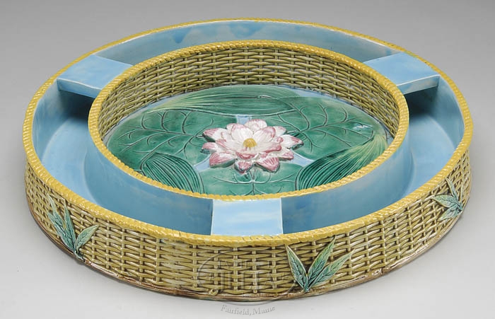 IMPORTANT GEORGE JONES WATER LILY AND BASKET WEAVE CENTERPIECE. Circa 1872. Fine Majolica centerpiece depicting pond lilies within a double ring of basket weave. This example is illustrated in Antique Majolica Around the House by Jeffrey B. Snyder, p. 192. SIZE: 2″ h. x 14-1/4″ dia. CONDITION: Very fine original condition, with minor wear and surface scratching on underside of base, tiny fleck on edge of one divider, small losses to glaze at tips of flower petals 9-99686 (1,000-1,200)