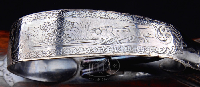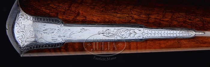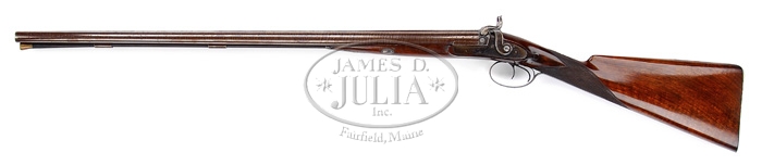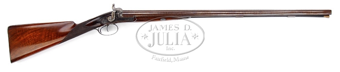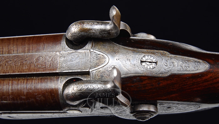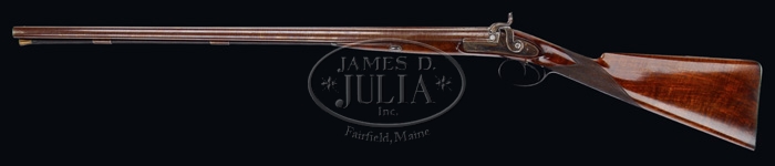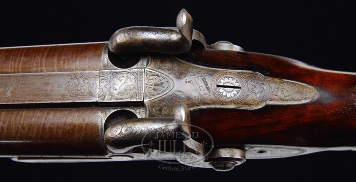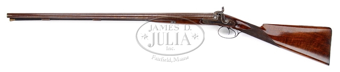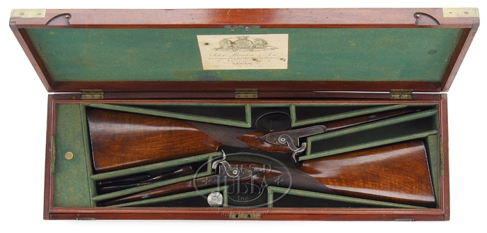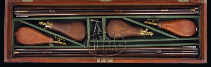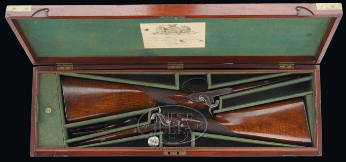 FABULOUS CASED PAIR OF JOHN MANTON & SON PERCUSSION DOUBLE BARREL SHOTGUNS. SN 10817 & 10818. Cal. About 14 bore. Spectacular pair of shotguns with 29-1/4″ Damascus bbls with raised, concave, smooth ribs & sgl beads. Ribs are marked with maker’s name & address. Each set of bbls has two Damascus guides on bottom containing their orig ebony & brass ramrods with concealed worms. They have beautiful front action locks and fine breech plugs with side reinforcements & platinum blow out plugs. Lockplates, hammers, breech plugs & trigger guards are beautifully engraved with two pheasants on each lockplate & a pair of bird dogs on trigger bow, surrounded by very nice, tastefully executed foliate arabesque patterns. Trigger guard & nose pipe have beautiful pineapple finials and buttplate tangs are long & stepped with a bird dog at each heel. They are mounted in matching, highly figured, tiger striped & feather crotch English walnut 1-pc stocks with a sgl wedge through forestock. They have 14-1/2″ LOP with checkered straight hand grip and smooth steel buttplates. They are accompanied by their orig green felt lined, walnut casing with concealed handle in lid & brass reinforced corners with maker’s label inside lid. Top tray is compartmented for the two stocks with various compartments containing an ebony handled turn screw, a thread cleaner & another small tool for deburring something along with a Hawksley pewter oil bottle. Bottom tray is compartmented for two sets of bbls with two leather covered Hawksley-type flasks & two leather & brass shot pouches. There is also a fine nipple wrench with concealed pick & spare nipple storage, along with a wad cutter. PROVENANCE: Glenn Marsh Collection. CONDITION: Extremely fine. Both sets of bbls retain virtually all of their orig dark brown Damascus pattern and lockplates virtually all of their orig bright case colors with most of orig shellac. Stocks are all sound with some minor flaking of finish on #10817 and both have moderately crazed finish. Buttplate on #10817 is glossy & bright orig blue. Buttplate on #10818 has flaked to about 50% glossy orig blue. Mechanics are crisp, bores are all strong with some fine pitting with moderate pitting in right bore of #10818. Case has three cracks in lid with some slight shrinkage and a loose joint or two, otherwise exterior has usual handling & storage marks and retains most of its orig finish. Interior is moderately faded & soiled showing light wear. One of flasks shows considerable dryness & a crack in leather, otherwise flasks are all fine. 4-59594 JR289 (12,500-17,500)