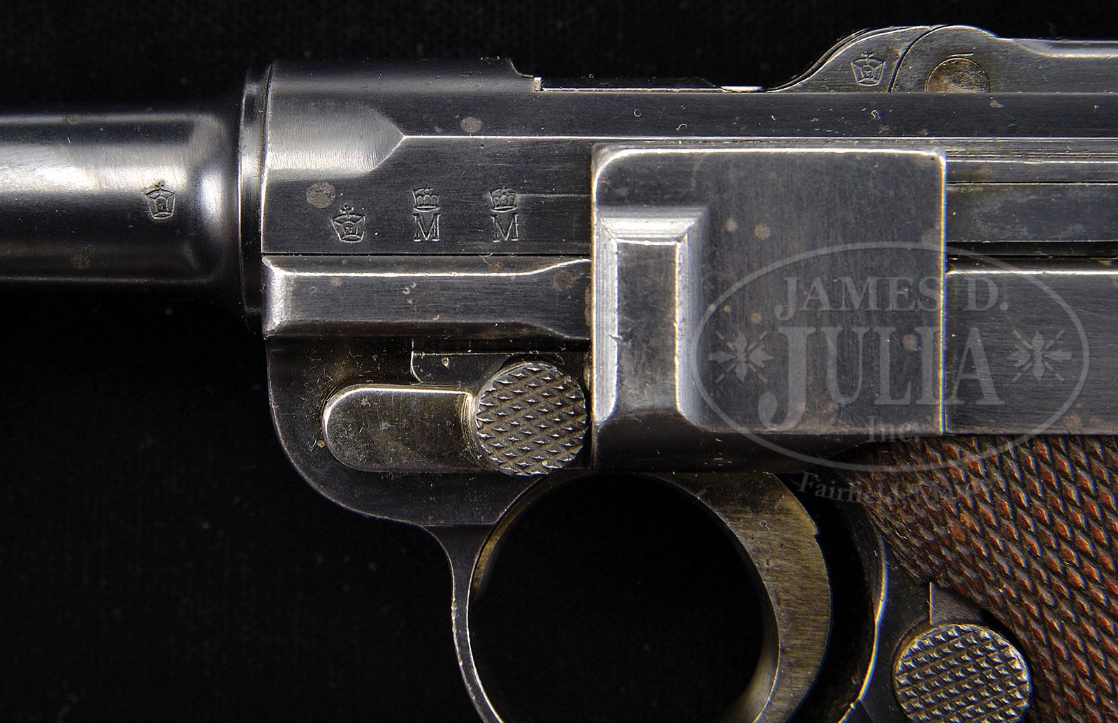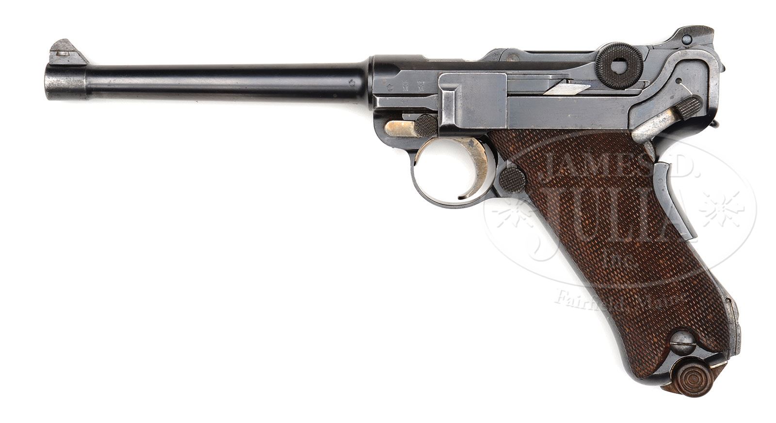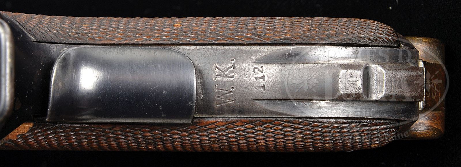 *◊ KIEL DOCKYARD 1906 NAVY LUGER FIRST VARIATION UNALTERED. SN 461. 6″ 9mm bbl. “DWM” on center toggle link. 100 meter/200 meter adjustable Navy rear sight. Crown M Proofs on receiver and bbl. Grip safety. “Gesichert” remains in lower position and has not been removed as has been done on most surviving examples of this model. Unit marked “W.K./112” (Kiel Dockyard Weapon Number 112) on lower rear grip strap. All numbered parts on the gun are matching. Proper concentric ring wood bottom magazine does not match. This gun is featured on pp. 272, 306, 568, 635, 872, 879, and 903 of Dr. Geoffrey Sturgess’ The Borchardt & Luger Automatic Pistols. PROVENANCE: Collection of Dr. Geoffrey Sturgess. CONDITION: Very fine retaining 95% orig blue and 60% orig straw with some areas of light scattered pitting common on guns exposed to sea air. Bore is lightly worn with light pitting. Checkered walnut grips are worn, with minor chips to checkering, and a chip under the safety. Magazine is excellent with a few minor dings on the front of the body. Mechanics are sound. 4-52900 BWS45 (6,500-9,500)