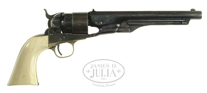 COLT MODEL 1860 ARMY REVOLVER. Cal. 44. SN 151140. Usual configuration, blue & case colored, with 8″ bbl, altered front sight with an added small rear sight dovetailed through the end of the bbl address. It has brass trigger guard & iron back strap with gorgeous 1-pc ivory grip. It has 3-screw case colored frame cut for shoulder stock but with rnd head hammer screw. Adjacent to the serial number on the bbl lug & butt strap are the tiny initials “IP” and adjacent to the serial numbers on the frame & trigger guard are the tiny initials “ISP”. CONDITION: As noted, very fine plus. All matching except the wedge, which is unnumbered. Bbl retains 70-75% glossy orig blue, strong in the sheltered areas, thinning & worn to a light patina elsewhere. Rammer handle retains about 50% orig case colors. Cylinder retains 45-50% orig blue, strong in the rebated area and retains about 90% Ormsby naval battle scene. All six safety pins are prominent. Frame & hammer retain most of their orig case colors, strong & bright on the sides, turning dark on the recoil shields & hammer. Back strap & butt strap are mostly a gray patina with an area of strong blue at the top. Trigger guard retains traces of orig silver-plating. Grip is spectacular with a couple of minor nicks on the edges and retains a wonderful mellow patina. Mechanics are crisp, strong bright bore with moderate pitting. 4-56814 JR444 (8,000-12,000)