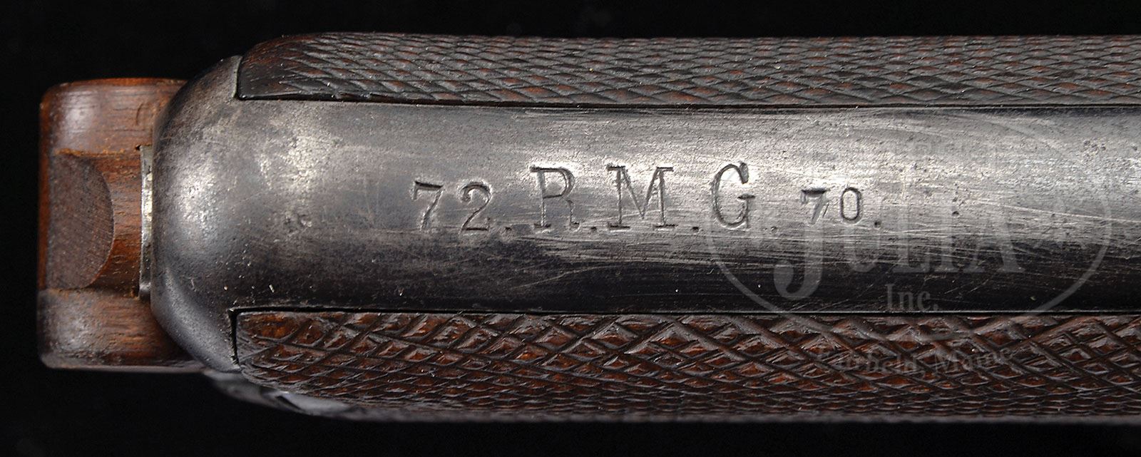 *◊ RARE 1907 “SELBSTLADEPISTOLE (LUGER)” MACHINE GUN DETATCHMENT SHORT FRAME NEW MODEL/P.08 CONVERSION LUGER. SN 40. 4″ 9mm bbl. “DWM” scroll on center toggle link. “72.R.M.G.70.” (Thuringisches Infantry Regiment # Nr. 72, Machine Gun Detatchment, Weapon #70). This gun was originally one of 220 delivered as a New Model with grip safety for instructional purposes to experimental machine gun detachments in mid-1907 in anticipation of P.08 adoption. After the P.08 entered service this gun was re-worked to P.08 configuration by removal of the grip safety and alteration of the Gesichert mark position at the Erfurt Factory with special inspection stamped safety lever parts and left grip plate. Holdopen added later in 1913, no stock lug, undated receiver ring. Partially visible lower “Gesichert” mark crudely removed from lower position and added to upper position to accommodate P.08 style safety. Large digit frame serial number exclusive to this special order batch. All numbered parts are matching. British proofed. This gun is featured on pp. 483 and 1151 of Dr. Geoffrey Sturgess’ The Borchardt & Luger Automatic Pistols. One of the rarest military variation Lugers. PROVENANCE: Collection of Dr. Geoffrey Sturgess. CONDITION: Fine. Retaining 70% orig blue and 40% orig straw with some parallel scratches and corrosion on front and back grip straps. Bore is lightly worn with frosting. Checkered walnut grips are moderately worn with minor indents and chips to checkering. Plain wood bottom magazine is excellent with some minor dings to the wood and scattered corrosion on the body. Mechanics are sound. 4-52916 BWS48 (10,000-15,000)