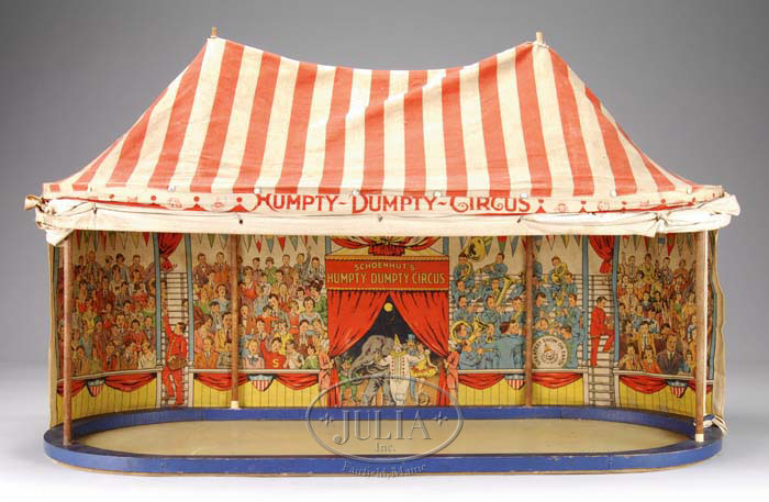 RARE DELUXE SCHOENHUT TENT WITH SIDE BANNER. Perhaps this is the most visually appealing tent that Schoenhut made that entrances not only Schoenhut collectors but all others who see this tent for the first time. The side banner simulates real banners of the time (1900s-1930s) featuring the Wild Man, the Bearded Lady, Siamese Twins. A plethora of people are staring in amazement or possibly disbelief at what they’re seeing, but eagerly prepared to spend money to see these abnormalities. Inside, the bleachers are packed with abundant spectators who gawk at the show below. This is a must have tent for any Schoenhut collector as well as one who would enjoy the folk art appeal of this toy. SIZE: Tent-42″ w x 26″ t x 18″ d. Banner-49″ w x 18″ t. CONDITION: Overall very good. Wood to sideshow banner has been expertly redone. Tent lacking some flags and banners on top. 1-7426 JL (5,000-10,000) Auction: Advertising, Toy & Doll - Spring 2007 Please Note: All prices include the hammer price plus the buyer’s premium, which is paid by the buyer as part of the purchase price. The prices noted here after the auction are considered unofficial and do not become official until after the 46th day. |