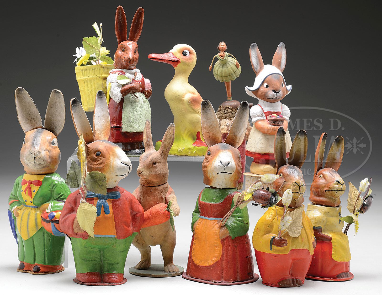 LOT OF TEN PAPIER MACHE CANDY CONTAINERS. A quality lot of hand-painted papier mache/composition candy containers, eight of which are Easter rabbits. Some are holding bouquets, carrots, or candy. Remove rabbit’s head or base to reveal container for candy. Most are of German quality. Lot also includes a composition duck candy container dated 1930 and a glass bottle with random wooden ballerina figure at top. SIZE: Tallest is 10″. CONDITION: One composition rabbit has broken foot, which is included. Otherwise, lot is clean, bright and very good. 1-13140 (800-1,200) Auction: Advertising, Toy & Doll - June 2013 Please Note: All prices include the hammer price plus the buyer’s premium, which is paid by the buyer as part of the purchase price. The prices noted here after the auction are considered unofficial and do not become official until after the 46th day. |