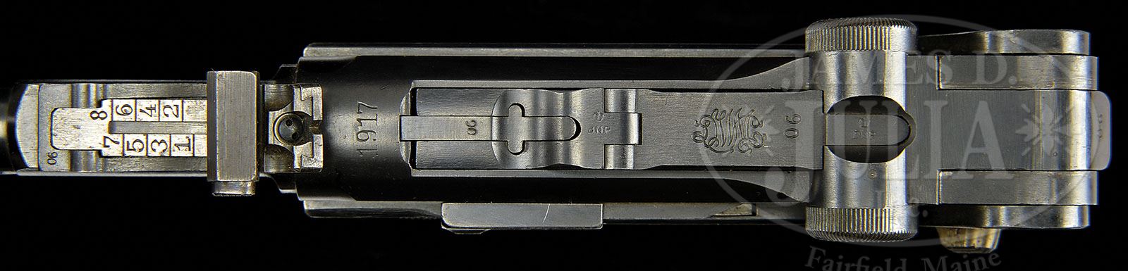 *◊ MATCHING DWM 1917 ARTILLERY LUGER RIG. SN 5206B. 8″ 9mm bbl with multi position adjustable artillery style rear sight that has fine-tuned adjustment as does front sight. “1917” above chamber. “DWM” on center toggle link. Imperial proofs on right side of receiver. British proofed. Wood bottom magazine is not numbered. All numbered parts are matching. With matching numbered artillery stock and brown leather holster with straps and leather attachments. Date and makers mark inside flap is illegible. Orig Imperial proofed takedown tool and artillery cleaning rod are included. This gun is featured on p. 527 of Dr. Geoffrey Sturgess’ The Borchardt & Luger Automatic Pistols. PROVENANCE: Collection of Dr. Geoffrey Sturgess. CONDITION: Excellent. Retains 97% orig bright blue with some light corrosion on sideplate and surrounding area. 90% orig straw with light scattered corrosion. Bore is bright and sharp. Grips are lightly worn with minor indents and nice color and wood grain. Magazine is excellent with minor wear. Mechanics are excellent. Holster is very nice with minor scuffs and some flaking on corners. Straps are wrinkled and flaking. Wood stock is excellent with minor dings and scratches. Takedown tool and cleaning rod are excellent. 4-52065 BWS94 (4,500-6,500)