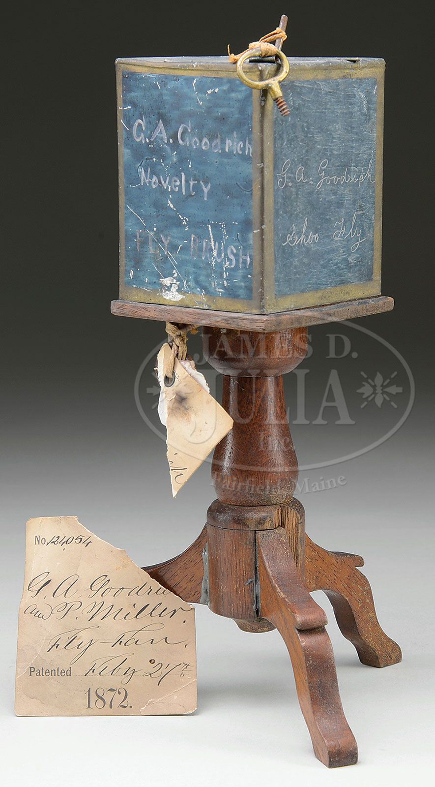 PATENT MODEL FLY FAN. Patented Feb. 27, 1872 by G.A. Goodrich & P. Miller, #124,054. Metal box on wooden tripod base presumably contains clockwork motor to rotate fan blades (no longer present). Painted on one side “G.A. Goodrich Novelty Fly Brush” and etched in script on one side “G.A. Goodrich Shoo Fly”. Accompanied by patent tag (torn) and Peterson tag. SIZE: 10-1/2″ h. CONDITION: Good with dents and scratches. Motor untested. 1-12168 (200-300) Auction: Advertising, Toy & Doll - Fall 2012 Please Note: All prices include the hammer price plus the buyer’s premium, which is paid by the buyer as part of the purchase price. The prices noted here after the auction are considered unofficial and do not become official until after the 46th day. |