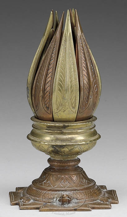 UNUSUAL FAR EASTERN BRASS AND COPPER LOTUS BLOSSOM INCENSE BURNER. 19th century. This exceptional table top example in the likeness of a Lotus blossom mounted upon a shallow urn joined to a stepped circular plinth supported on the back of a fanciful turtle on a carpet with stepped and inset corners. Upon turning the lotus blossom within the urn, it elevates on a spiral twist shaft allowing the blossom to open exposing a bowl form censer in which incense is burned. This example, nicely hammered, etched, and decorated is made of copper and brass elements artfully combined. SIZE: h. closed 7″ CONDITION: Structurally in very good condition with original surfaces and very nice patina. 9-99164 (200-300)