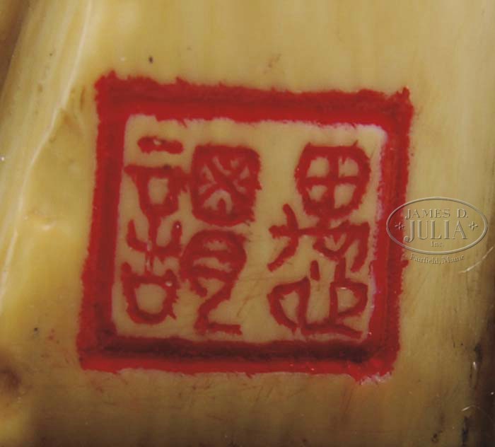 IVORY FIGURAL GROUP. Chinese, 20th century. Signed. Depicting two bearded scholars beneath a conifer tree. The whole ink highlighted and mounted on a hardwood stand. SIZE: 9-3/4″ h overall. PROVENANCE: From a fine New Jersey home. CONDITION: Very good with mellow color and good patina. 9-24548 (800-1,200)