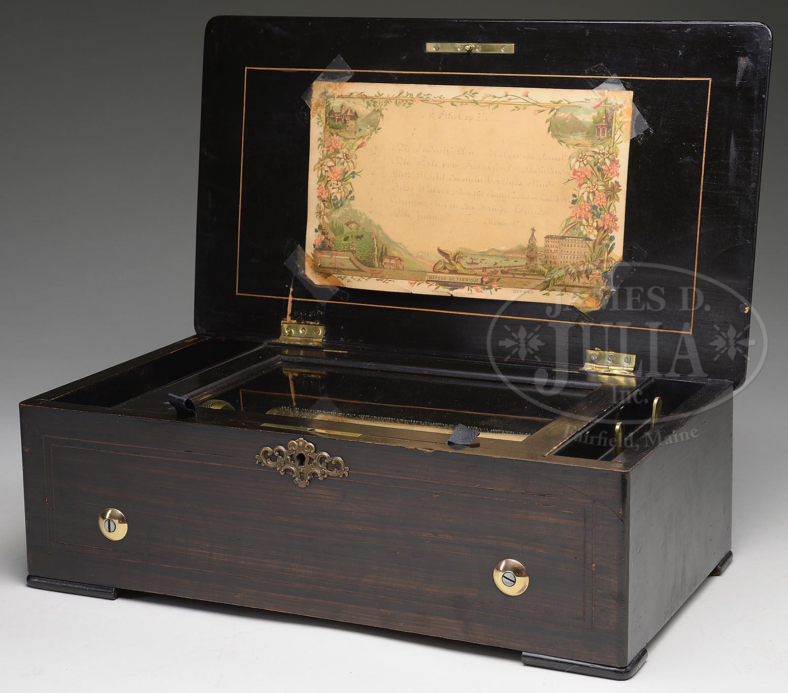 MERMOD SIX TUNE CYLINDER MUSIC BOX. Six tune cylinder is 8-1/2″ long. Single spring and jeweled government. Automatic repeat. Case is a nice strong, solid wood with string inlay and painted grain finish. Nice big brass escutcheon for lock is 2-1/2″ tall by 1-1/4″ wide. Has nice original tune card in the lid, very colorful with scenes of flowers and vines. SIZE: 17″ w x 9-1/2″ d x 6″ t. CONDITION: Movement has been recently restored and has a very pleasant resonant tone. Case has original finish with a couple of minor scratches that can be touched up. 1-13524 (1,200-1,500) Auction: Advertising, Toy & Doll - Fall 2013 Please Note: All prices include the hammer price plus the buyer’s premium, which is paid by the buyer as part of the purchase price. The prices noted here after the auction are considered unofficial and do not become official until after the 46th day. |