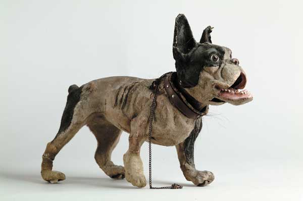 FRENCH BARKING BULLDOG. When you pull his chain, mouth opens and a simulated barking sound is emitted. SIZE: 19″ l. CONDITION: Collar missing most of hair. Damage to legs, flocking is poor, overall poor condition. 1-116 (150-200) Auction: Advertising, Toy & Doll - Spring 2003 Please Note: All prices include the hammer price plus the buyer’s premium, which is paid by the buyer as part of the purchase price. The prices noted here after the auction are considered unofficial and do not become official until after the 46th day. |