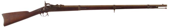 SPRINGFIELD M1865 CONVERSION MUSKET. Cal. 58RF. NSN. 37-3/4” rnd bbl. Dated “1865” on lockplate. “ESA” cartouche on left side of stock. Ramrod is a replacement. CONDITION: Light to moderate pitting overall. Stock has been cleaned and re-oiled. There is a small chip missing on right side of stock at extractor. Mechanically fine. 4-31016 FS152 (1,500-2,500)