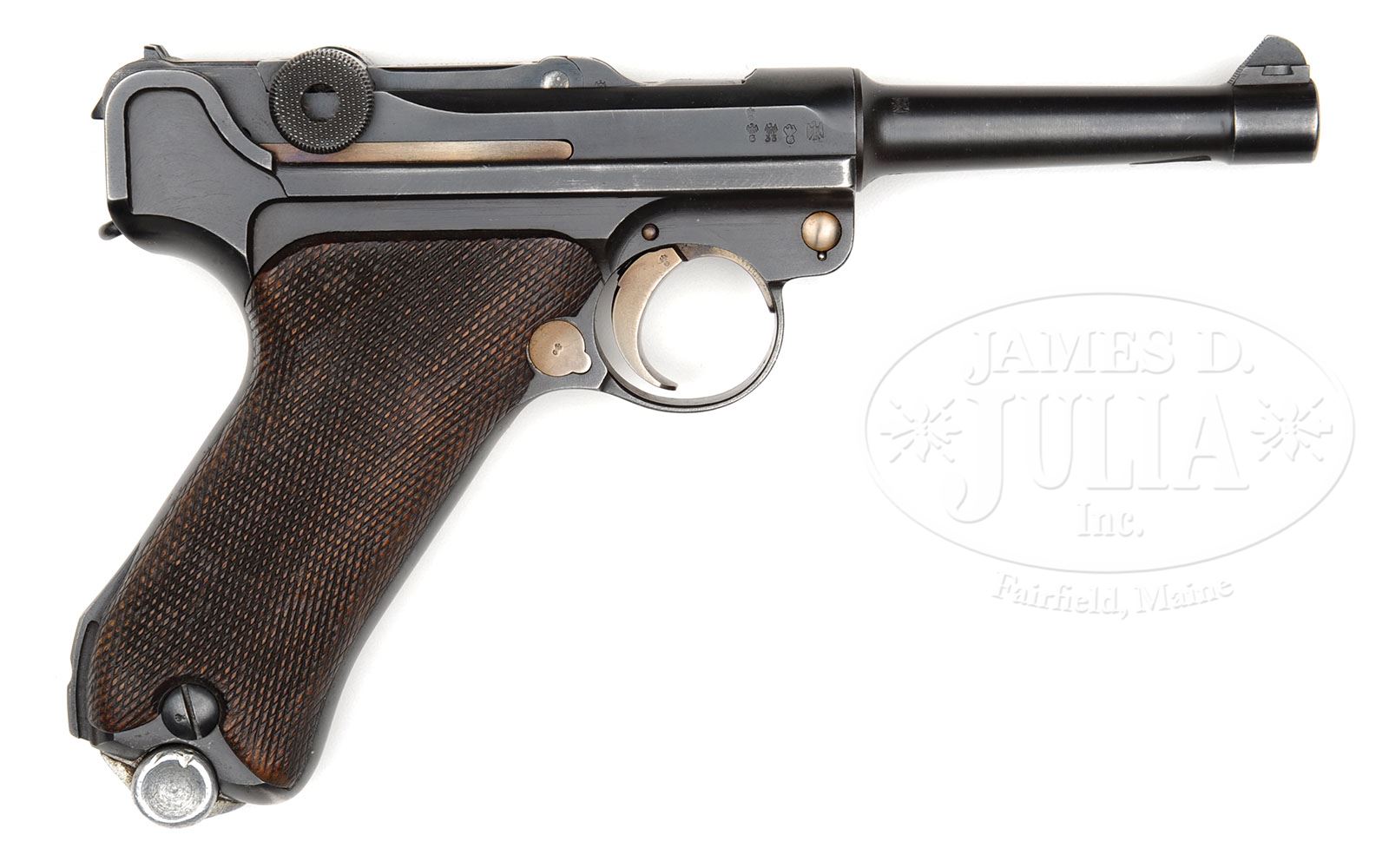 *◊ LUGER SIMSON MILITARY/POLICE CONTRACT. SN 9653. Police issue with sear safety. 4″ 9mm bbl. “Simson & Co Suhl” marked on center toggle link. Eagle/6 proofs (shown on p. 467 of Dr. Geoffrey Sturgess’ The Borchardt & Luger Automatic Pistols). All serial numbers on the gun are matching, including the checkered walnut grips which have the full four digit serial number and Eagle/6 proofs. Some internal small parts were numbered by the police arsenal. The proper aluminum bottom Simson magazine does not match. PROVENANCE: Collection of Dr. Geoffrey Sturgess. CONDITION: Very fine retaining 96% original bright blue and 85% original straw. Bore is bright with light wear. Grips are worn with indentations. Magazine is very good with a few dings in the bottom. Mechanics are sound. 4-52943 BWS4 (2,500-3,500)