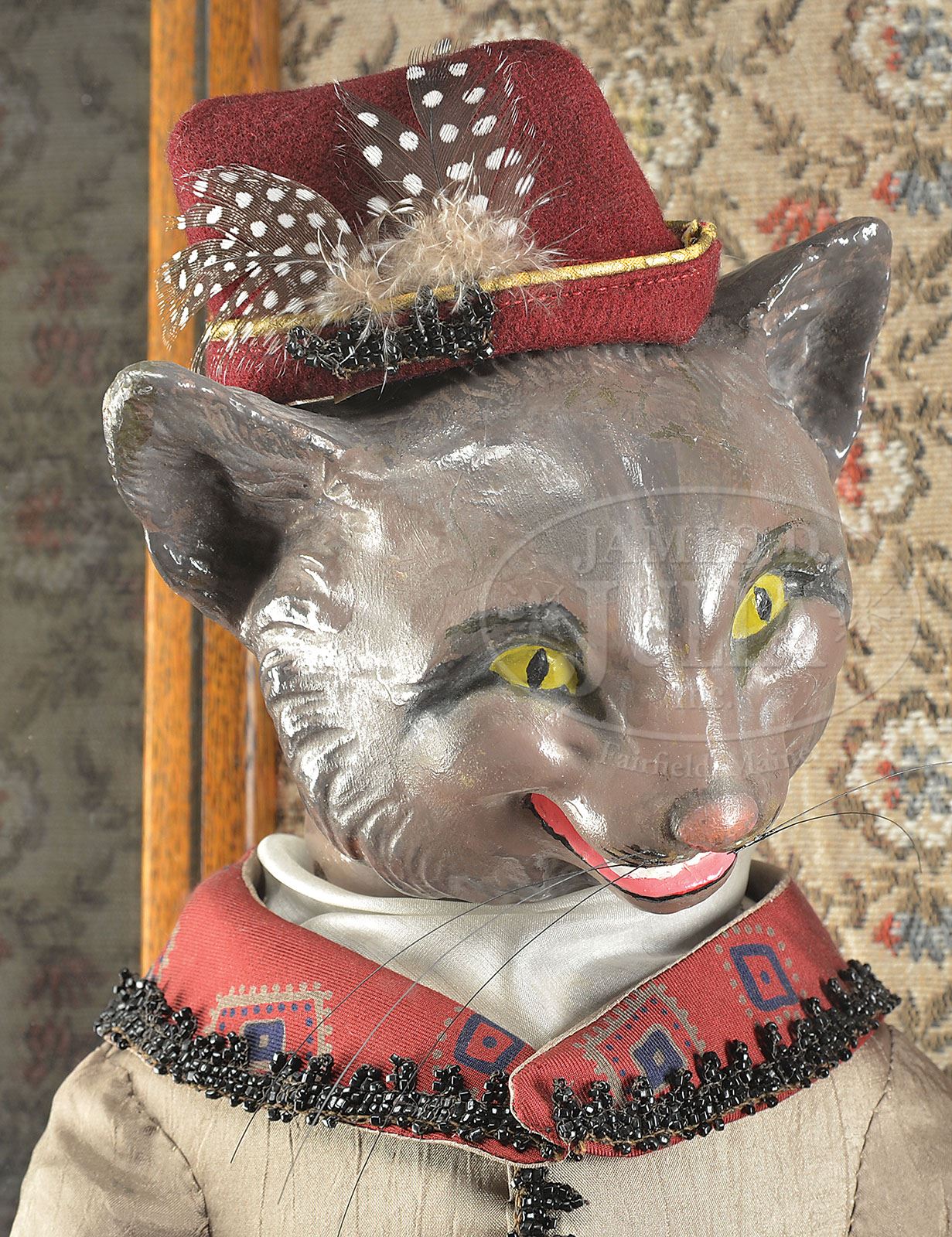 ROOVERS “PUSS AND BOOTS” FORTUNE TELLER MACHINE. A classic mechanical fortune telling device featuring the beloved fairy tale figure Puss in Boots. When a coin is placed in the slot and the handle on the right side of the machine is pulled, a series of motions occur. The cat dips his head, his arm holding a dustpan style tray receives a card from the vendor while his right hand, which holds a cane, lifts the lid of the wicker basket, and his body turns to drop your fortune from his tray, all while the cat’s head turns and nods. An absolutely incredible amusement device contained within an oak cabinet with glass panels on three sides. The machine itself sits upon four iron legs and the overall appearance is quite pleasing to not only collectors of coin operated machines, but the public at large. According to the consignor, while an original, it was professionally restored by Mike Gorski to his exacting standards. SIZE: 76″ h x 16″ d x 16″ w. CONDITION: Overall very fine, lacking wooden paneled door to card vendor on right side of machine. Also lacking small metal (6″ x 6″) insert panel on rear of machine as well. 1-12736 (8,000-12,000) Auction: Advertising, Toy & Doll - June 2013 Please Note: All prices include the hammer price plus the buyer’s premium, which is paid by the buyer as part of the purchase price. The prices noted here after the auction are considered unofficial and do not become official until after the 46th day. |