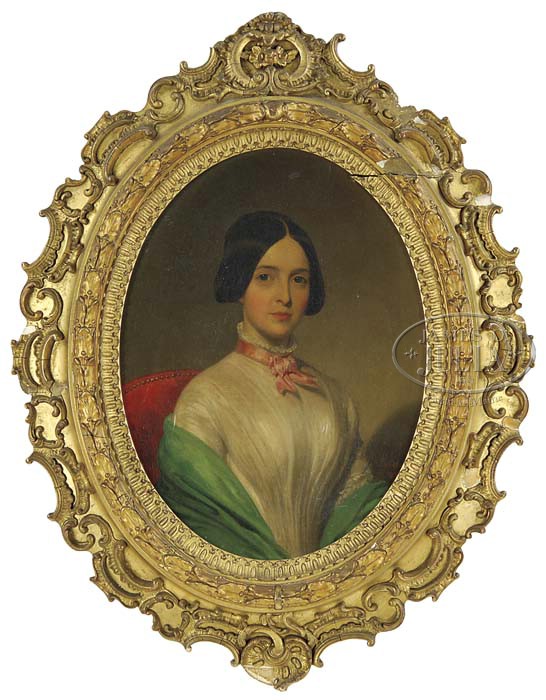POWELL (American, First half of the 19th Century) PORTRAIT OF A YOUNG WOMAN. Oval oil on canvas half portrait showing a young woman with brown hair seated in a red upholstered chair wearing a white dress, pink neck ribbon and green shawl. Signed lower right “Powell 1848”. Possibly by William Henry Powell (American, 1823-1879) Housed in its original fancy gesso decorated oval frame. The canvas having an “Edwd. Dechaux New York” canvas stamp. SIZE: 16″ x 12″. CONDITION: Slight touch ups which are visible, very good. 9-21881 (800-1,200)