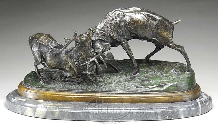 AFTER PIERRE JULES MENE (French, 1810-1879) TWO ELK FIGHTING. Recast bronze numbered “32/85″ showing two elk head to head in a challenge duel. Nice verdigris brown patina. Signed in casting along with the edition number. The oval base mounted with larger molded edge oval granite base. SIZE: Bronze: 21-1/2″ l x 11″ w x 10-1/2″ h. Incl Base: 24-1/2″ l x 14″ w x 12″ h. PROVENANCE: Estate of Henry A. Rudkin Jr, (family of the founders of Pepperidge Farm). CONDITION: As cast with a visible 3” crack in ground surface. 9-98988 (400-600)