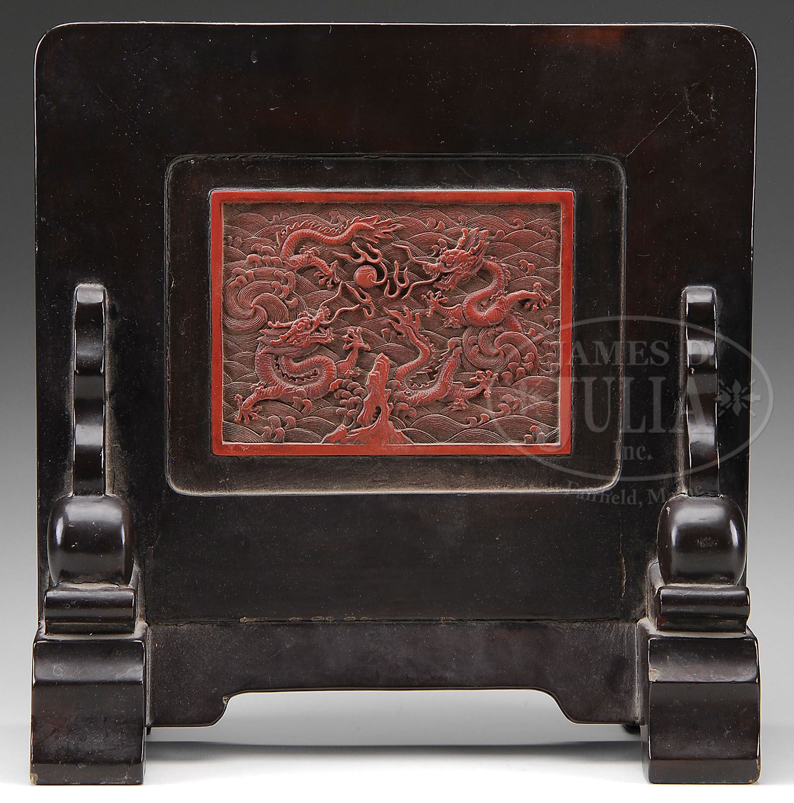 HARDWOOD LACQUERED TABLE SCREEN. 19th century, China. The lacquered panel inlaid with various hardstones and abalone of floral foliate design. The reverse, a carved cinnabar panel depicting opposing dragons chasing a fiery pearl. SIZE: 15″ h x 14-1/4″ l x 6″ d. CONDITION: Lacquer with minor deterioration at seams and craquelure within panel. Cinnabar panel very good. 9-28152 (300-500)