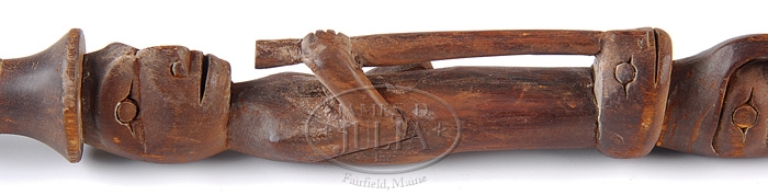 RARE NORTHWEST COAST NATIVE AMERICAN SPEAKER’S STAFF. Late 19th century. This nicely carved cypress staff depicting three human figures; the topmost holding a fish and wearing the headdress of a cat, the middle figure holding a staff with conical headdress and the bottom figure wearing a trunkated headdress, holding a rabbit and standing on a turtle head(?). The staff surmounted by a pommel grip and having an elongated tip. Probably Pacific coast of Vancouver island. SIZE: L 33 3/4″ PROVENANCE: From a private Maine collection. CONDITION: Very fine original condition with good patina. All carvings intact except top figure’s arms may be repaired or replacement. 9-96703 (5,000-7,000)