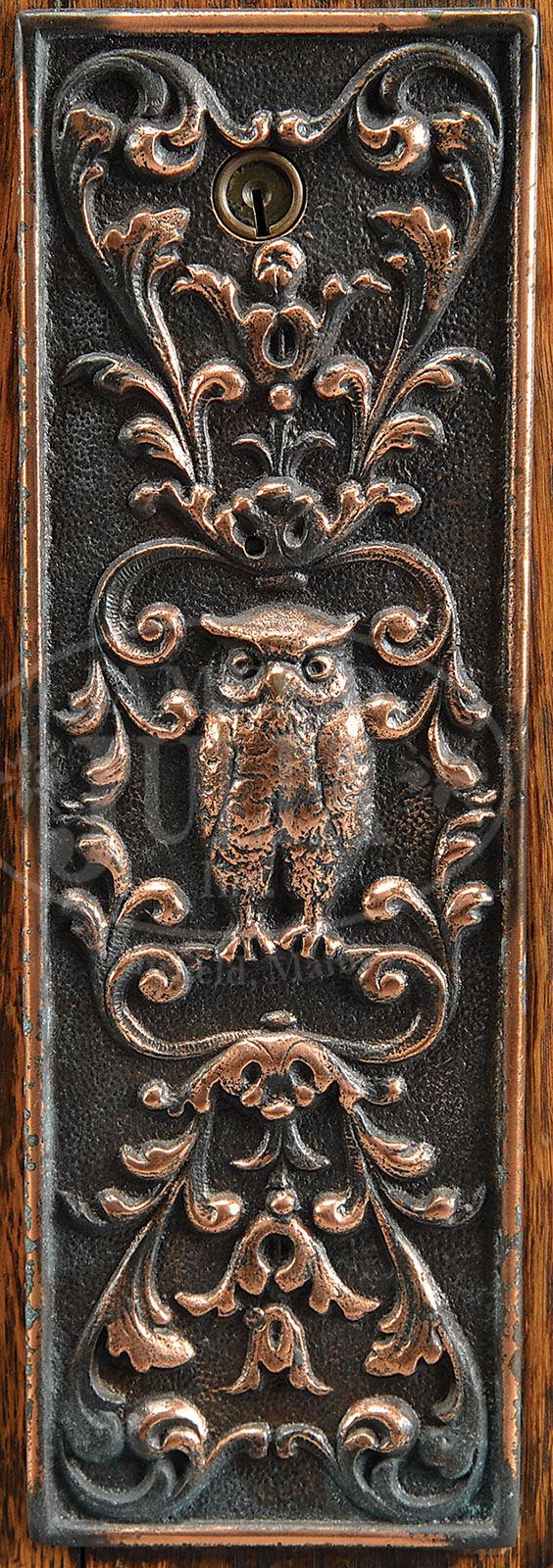 MILLS FLOOR MODEL STRENGTH TESTER. An attractive strength tester, somewhat petite in size, but large in appeal and presence. A front paneled oak cabinet with a hexagonal top featuring the paper dial encased behind and electroplated iron trim (paper possibly original). Dropping a nickel in the slot, one would stand on the iron base and pull the handles upward to see how much one could lift. A fanciful cast side cash box drawer with the typical owl logo on side casting. Machine overall is complete and in working order, but in need of some minor lubrication/adjustments. SIZE: 50″ h x 25″ d x 14″ w. CONDITION: As described above. Trapezoidal rear oak door an older replacement. 1-12741 (1,000-2,000) Auction: Advertising, Toy & Doll - June 2013 Please Note: All prices include the hammer price plus the buyer’s premium, which is paid by the buyer as part of the purchase price. The prices noted here after the auction are considered unofficial and do not become official until after the 46th day. |