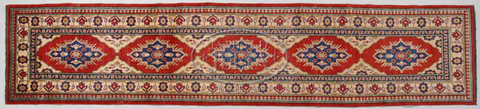 HERIZ ORIENTAL RUNNER. Last half of the 20th Century. Five center diamond medallions in colors of ivory, red and blue. SIZE: 12’7” x 2’8”. CONDITION: Very good. 9-73861 (400-600)