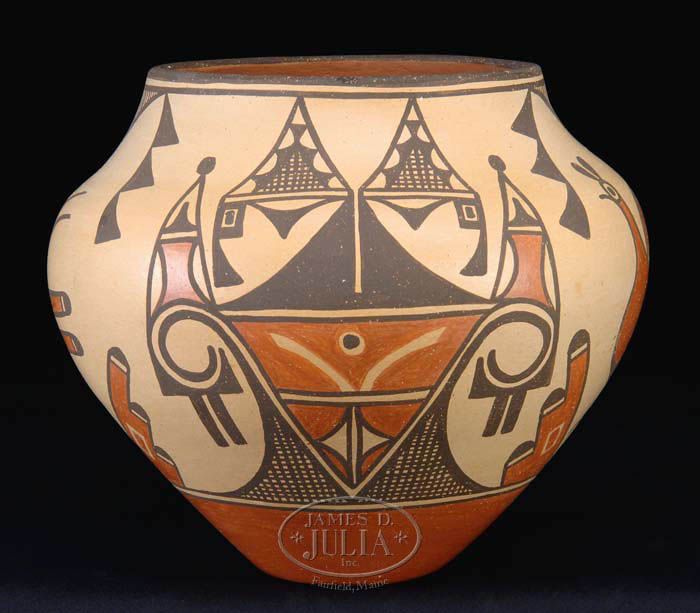PAINT DECORATED ZIA POT SIGNED SOFIE MEDINA. The wonderful contemporary pot having bird and geometric designs fully signed on side. Sofia Medina is highly recognized for her superior workmanship. SIZE: 9-1/4”h x 10-1/2” dia. CONDITION: Very good. 9-73416 (250-400)