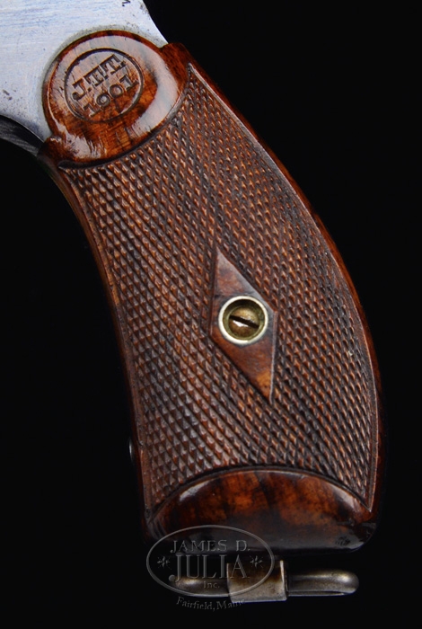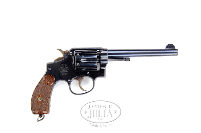 *RARE SMITH & WESSON 38 HAND EJECTOR M&P FIRST MODEL DA REVOLVER. SN 13666. Cal. 38 Colt and 38 Spcl. Blue finish with 6” bbl, integral half moon front sight with usual bbl & frame markings. It has diamond checkered 2-pc walnut rnd butt grips with “JTT / 1901” on left side and “K.S.M” on right side in panels at top. Left side of frame, back of cylinder & bottom of bbl also have the “K.S.M” initials. Butt has the Model 1899 Army markings with a lanyard loop in butt strap and serial number on front strap. Only 1,000 of these scarce revolvers were made and delivered in 1901. CONDITION: Very fine plus, all matching. Overall retains about 95% strong orig blue with muzzle & slight side of bbl wear with some sharp edge wear on frame and light etching in a couple of spots on sides of frame. Grip frame retains most of its strong orig blue. Grips are crisp. Mechanics are fine, brilliant shiny bore, appears to be unfired. 4-31215 JR615 (3,000-6,000)