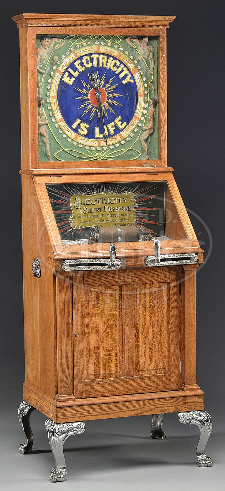 MILLS “ELECTRICITY IS LIFE” SHOCK MACHINE. A classic and very impressive coin-operated shock machine with tremendous visual appeal. The upper portion of the case features a large papier mache plaque that features various embossed male figures, a circular section corresponding to your shock level with detailed description such as “These points indicate healthy heart” or “Increased voltage will benefit system”. As one proceeds to engage the handles, and the voltage increases, an arrow indicator with the Mills trademark owl rises in number and intensity, becoming a testament to your tolerance for pain. A large cast iron plate sits behind the glass viewing window, in the center of this plate is the rheostat that increases voltage. But perhaps more interesting is the visual appeal of the iron plate. Embossed on the iron plate is Ben Franklin holding a kite with Colonial buildings in the background and lightning bolts striking down at his kite. The machine is encased in a restored oak front paneled cabinet with fanciful iron legs. All castings have been replated in nickel and the background glass exclaiming “Electricity–the silent physician”. Original iron cased cash box enclosure within lower portion of cabinet. SIZE: 78″ h x 25″ d x 28″ w. CONDITION: Machine has excellent older restoration. Mechanics appear to be intact, but in need of attention, machine is untested. Decorative handle enclosures appear to be older replacements and perhaps not exact and proper. 1-12991 (10,000-15,000) Auction: Advertising, Toy & Doll - June 2013 Please Note: All prices include the hammer price plus the buyer’s premium, which is paid by the buyer as part of the purchase price. The prices noted here after the auction are considered unofficial and do not become official until after the 46th day. |