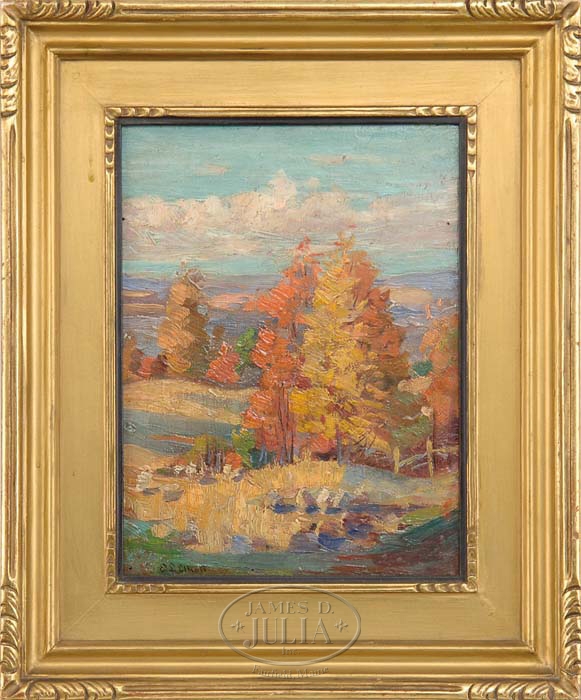 EMILY LOUISE ORR ELLIOTT (Canadian, 1867-1952) PANORAMIC FALL LANDSCAPE. Colorful oil on board fall scene shows colorful trees against a low hill and blue cloud sky background. Signed lower left “E. L. Elliot”. Housed in its original period gilt and carved wood frame. Haynes Art Gallery Toronto label on back. SIZE: 9-3/4” x 7-1/2”. CONDITION: Very good. 9-70802 (650-850)