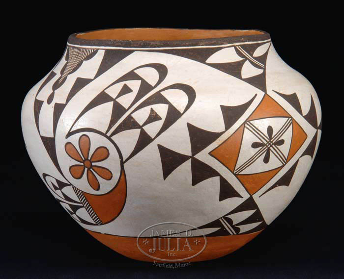 UNSIGNED POLYCHROME DECORATED ACOMA POT. White background decorated with black and red diamonds and other motif. SIZE: 8”h x 10” dia. CONDITION: Very good. 9-73415 (200-300)