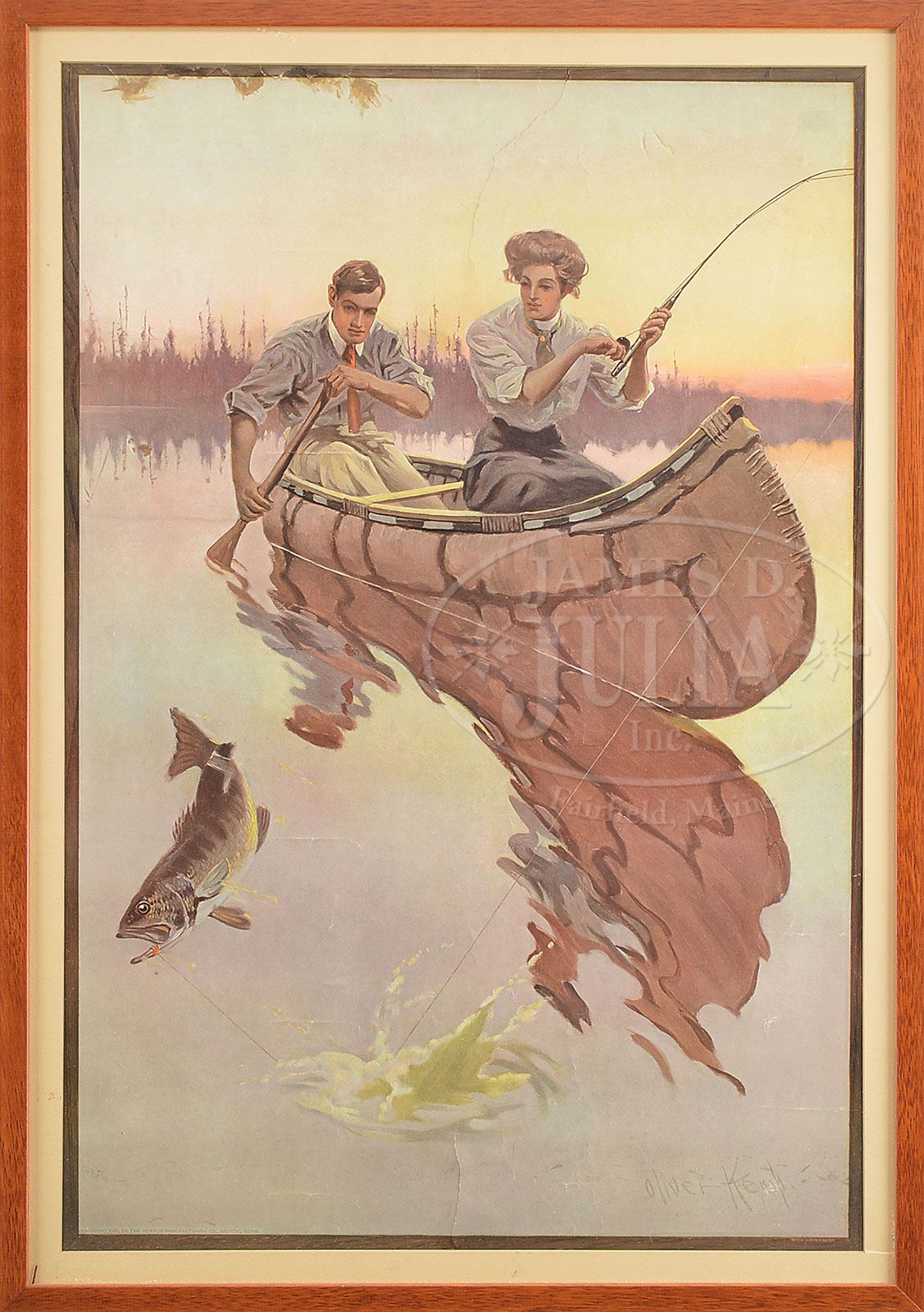 Glued to board. There are no metal bands on top or bottom. BRISTOL FISHING RODS 1909 POSTER. Artist illustration by Oliver Kemp of young couple bass fishing in their birch bark canoe. Bottom of poster reads “Copyright 1908 by the Horton Manufacturing Co. Bristol, Conn”. This image was also used on their 1909 calendar and 1910 catalog. SIZE: Sight: 19″ w x 28-5/8″ t. CONDITION: Good; has a number of closed tears, the most prominent being a 5″ vertical at 12 o’clock; some border tears and adhesive discoloration upper left hand corner; some color touch-up to small areas of paper loss at top margin. No trace of a calendar date pad ever being attached. 1-13194 (800-1,200) Auction: Advertising, Toy & Doll - Fall 2013 Please Note: All prices include the hammer price plus the buyer’s premium, which is paid by the buyer as part of the purchase price. The prices noted here after the auction are considered unofficial and do not become official until after the 46th day. |