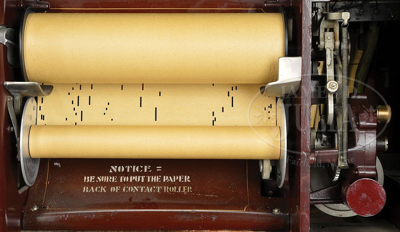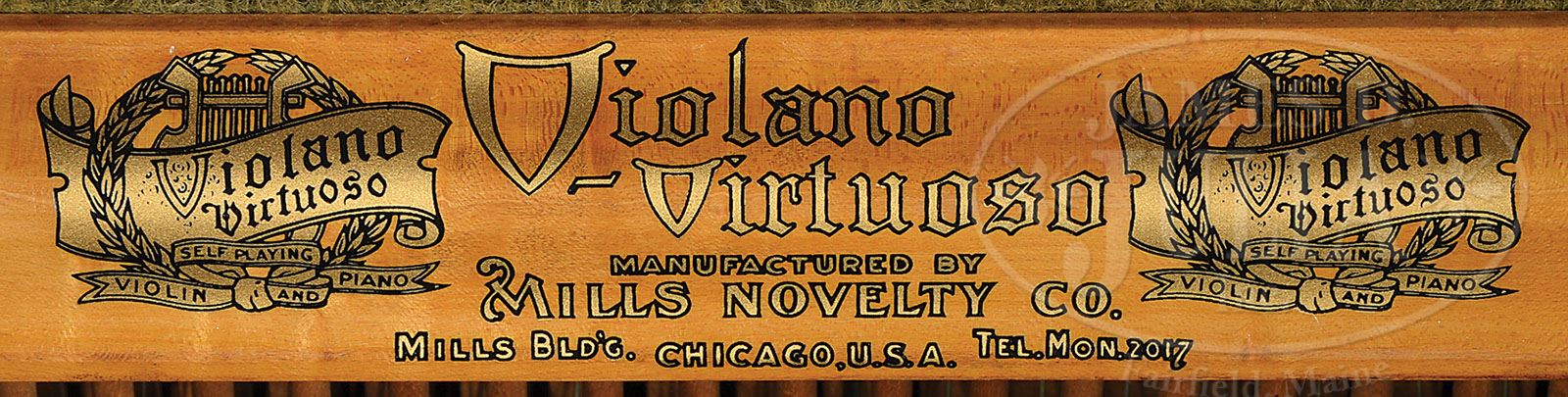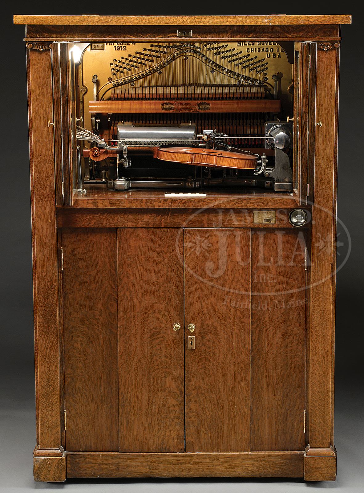 MILLS VIOLANO VIRTUOSO. Beautiful tall oak case with full length capped columns has beautiful book matched quarter sawn oak veneer. Four doors in top have beveled glass for viewing the violin and piano. Bottom has double doors and there is a door in the top with an adjustable prop that can be raised to increase the volume of the violin. Coin slot in middle of right front. Inside is illuminated for better viewing of violin and piano workings. Plays multi tune roll. Has four buttons in front of violin for tuning. Plays well but violin definitely needs tuning. SIZE: 43″ w X 31″ d X 64″ t. CONDITION: Beautiful oak case has been professionally refinished in a medium oak color. Violin and piano have been nicely restored. Roll mechanism and switches retain their original stencils and paint. Has been updated with modern DC converter. 1-12763 (20,000-30,000) Auction: Advertising, Toy & Doll - June 2013 Please Note: All prices include the hammer price plus the buyer’s premium, which is paid by the buyer as part of the purchase price. The prices noted here after the auction are considered unofficial and do not become official until after the 46th day. |