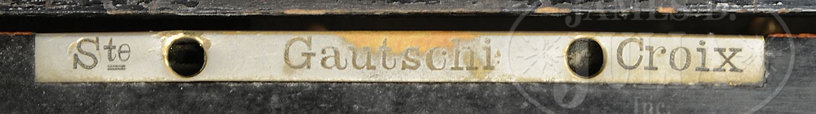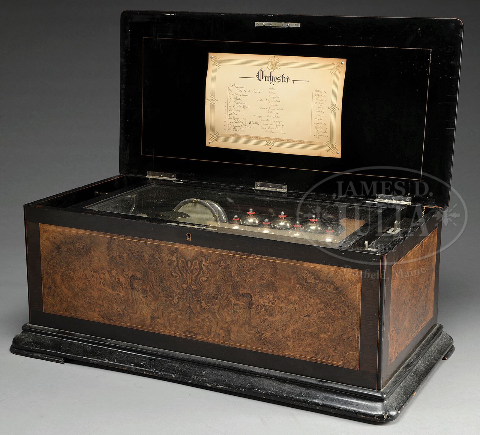 18″ CYLINDER MUSIC BOX WITH DRUM AND BELLS. Originally sold by “Henry Gautschi and sons of Philadelphia”. The lock is engraved “Gautschi Ste. Croix”. Twelve tune music box plays on an 18″ cylinder with double spring motor that has a damaged gear and governor gear train (does not play). Has 4-3/4″ snare drum, 7 brass bells and a little wood block. Combs are in great condition with the exception of two missing teeth. Mechanism appears to be restored not too long ago, but the 22 note reed organ is missing. Has shut off levers for wood block, bells and drum. Case is unrestored but should be an easy restoration. Small bubbles in burl veneer on lid which has string inlay. Same book matched veneer on front and ends. Nice heavy molding around base. SIZE: 35″ w X 18-1/2″ d X 14″ t. CONDITION: Base is missing one foot. Lid has slight warp to it. Right rear corner has split. Right front corner is slightly loose. 1-12957 (2,000-3,000) Auction: Advertising, Toy & Doll - June 2013 Please Note: All prices include the hammer price plus the buyer’s premium, which is paid by the buyer as part of the purchase price. The prices noted here after the auction are considered unofficial and do not become official until after the 46th day. |