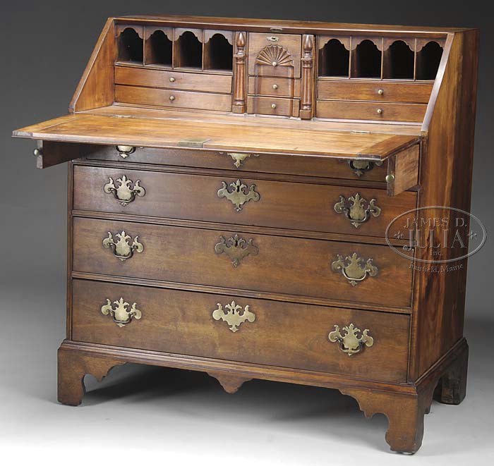 NEW ENGLAND CHIPPENDALE BIRCH SLANT LID DESK. Last quarter 18th century. The rectangular dovetailed case with hinged sloping lid opening to an interior fitted with a central bank of three blocked drawers, the uppermost shell carved. Flanked by document drawers applied with engaged half columns further flanked by an arrangement of valanced cubbyholes over a bank of two stationary drawers over four graduated long drawers, the uppermost flanked by lopers, on a molded base raised on bracket feet with shaped and scalloped returns and a central pendant. SIZE: 42-1/2″ h x 40″ w x 22″ d. CONDITION: The desk has been professionally refinished and with original brasses. 9-21908 (1,800-2,200)