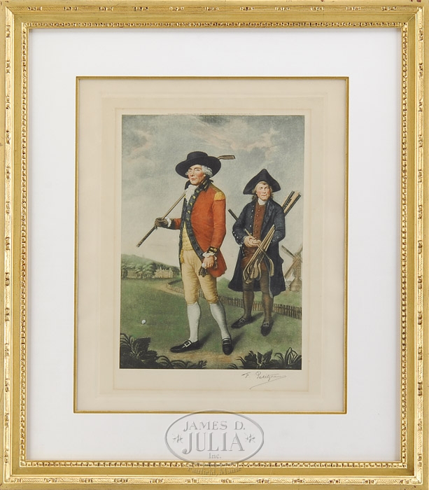 F. PETITJEAN (First half of the 20th Century) THE GOLFER. Colored engraving shows a well dressed golfer with his caddy in a golf course setting. Copyright 1925 by Henry Graves & Co., London. Housed in a good carved wood gilt frame with white and gold liner. SIZE: Sight: 18″ x 14-1/4″. CONDITION: Some slight toning at old frame edge, good. Not examined out of frame. 9-92911 (400-600)