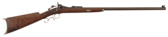 RARE PROBABLY ONE OF A KIND BERDAN SPORTING RIFLE. Cal. 42 Berdan. SN 1. This rifle was built by Colt in the period circa 1868 when every manufacturer was scrambling to produce a sporting rifle for the “Manifest Destiny” westward expansion. Undoubtedly it was built by Colt’s master gun makers under the direct supervision of Hiram Berdan, perhaps even by Mr. Berdan himself. This fine rifle utilizes the Type 3 breechblock and has a 26-1/2” medium weight, rnd bbl, globe front sight, no provision for rear sight and an unusual tang sight mortised into top of wrist. It has a 2-1/2” long thick staff with a Sharps type eye cup that is dovetailed onto the beveled staff with a delicate windage knob & bar built in. The slide is secured only by the friction of the dovetail. Mounted in a highly figured, uncheckered, flame grain, American walnut half stock with straight grip, secured with a single wedge through the forearm and a screw through the top tang. It has a pewter nosecap with triangle shape that has a ball at the apex. Wedge is through two German silver escutcheons and it has a fancy, German silver, serpentine triggerguard/finger rest. It also has an unusual single set trigger. Buttplate is of nickeled brass, crescent in shape with a thick toe and stepped tang. This is a Model 1874 Sharps type S-20 (Target) buttplate, possibly procured by Hiram Berdan from Sharps, as he had close ties with that company as well as Colt. The back action lock is mortised into wrist with a wood screw at back end and is attached to receiver at the front end with a short machine screw. It is case colored and very nicely engraved as is the hammer with a dolphin style engraved nose. This exact rifle is fully illustrated in three photographs and discussed in some detail on p. 183 of Hiram Berdan Civil War Chief of Sharpshooters Military Commander and Firearms Inventor, Marcot. It is well known that Berdan was employed at Colt as a firearms designer in the period immediately following the Civil War. This rifle may have been Mr. Berdan’s personal possession, although at this time no documentation is available. The serial number is in pencil on the inside of various parts and there is a small “1” stamped on the small breechblock parts. CONDITION: Fine. The bbl retains thin orig brown finish in very sheltered areas, very strong brown under forearm & breechblock with balance a cleaned gray/brown patina. Stock is sound with minor handling & storage marks and retains about all of an old restored finish. Lockplate & hammer have dark case colors, very bright on inside . Breechblock retains most of its orig case colors, fading to patina over the top, stronger & brighter on inside. Breechblock base retains 75-80% orig blue. Mechanics are fine, bright shiny bore. A truly rare & one of kind rifle. 4-30059 (15,000-25,000)
