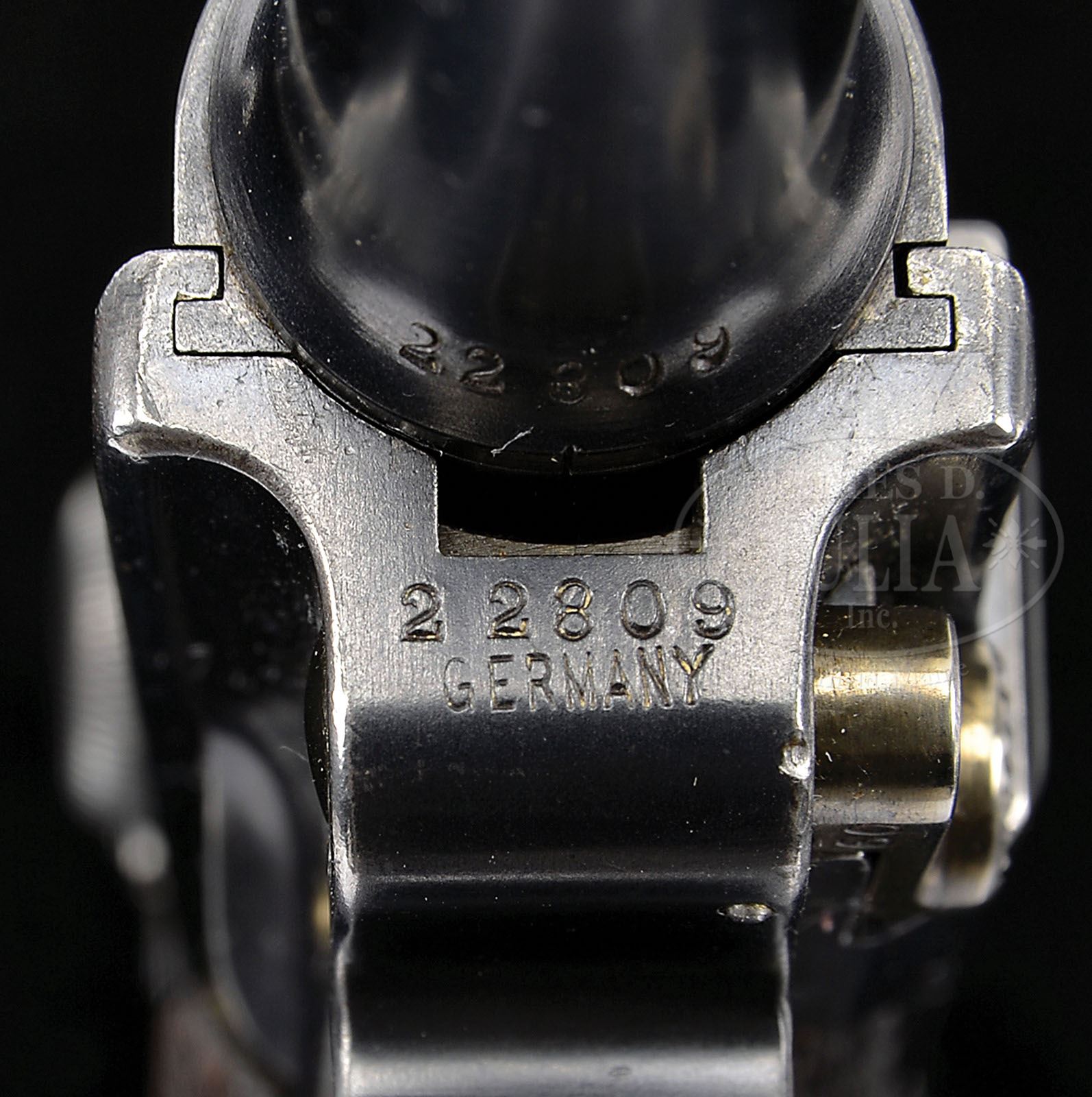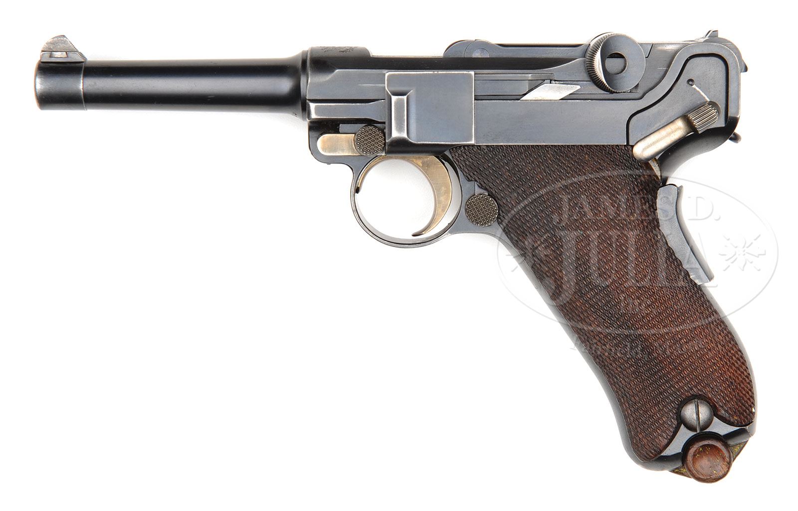 *◊ DWM 1902 AMERICAN EAGLE “FAT BARREL” 9MM LUGER. SN 22809. 4″ 9mm “fat barrel”. American eagle on chamber. “DWM” scroll on center toggle link. Dished toggles. Grip safety. “GERMANY” marked under serial number on front of frame. Checkered walnut grips. Proper wood bottom “Cal. 9mm” marked magazine. All numbered parts are matching. This gun is featured on pp. 305, 600, and 601 of Dr. Geoffrey Sturgess’ The Borchardt & Luger Automatic Pistols. PROVENANCE: Collection of Dr. Geoffrey Sturgess. CONDITION: Excellent retaining 95% orig blue with silvering on sharp edges and gripstraps that are just starting to brown. Retains 95% straw that has been reheated. Bore is lightly worn with frosting. Grips are lightly worn with a chip on the left grip under the safety. Magazine is very good with some dings and minor chips to the wood bottom and scattered light corrosion on the body. 4-52761 BWS76 (10,000-15,000)