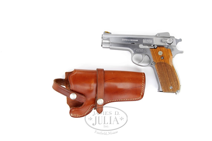 *SMITH & WESSON 639 STAINLESS STEEL PISTOL. SN A796318. Cal. 9mm. Standard 4″ bbl. Stainless steel slide is mounted with ramp front sight and yellow insert and winged adjustable rear sight and left side mounted safety. Stainless steel frame with its 8-shot magazine and wooden checkered grips with Smith & Wesson insignia. The 639 is an all stainless version of the original Model 39, which was Smith & Wesson’s first double action 9mm pistol. This model was discontinued in 1988. It is accompanied with its right hand Smith & Wesson leather holster Model 2034. PROVENANCE: Glenn Marsh Collection. CONDITION: Fine. Just some usual wear marks from being in and out of the holster. Grips are solid with a few light nicks and scratches and finish flaking at the sharp edge. Mechanics are crisp. Bore is shiny. 4-59626 BT98 (300-500)