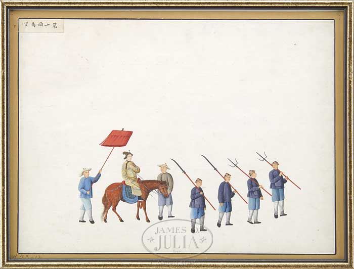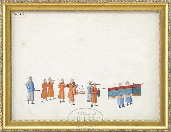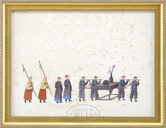 TWELVE CHINESE EXPORT PAINTINGS. Mid 19th century, China. Ink and colors on paper depicting various processional scenes. Each mounted within a contemporary gilt frame under glass. Each titled on front, top left corner facing. SIZE: Sight: 14-1/2″ x 19-1/2″. CONDITION: Structurally good, colors remain strong and vibrant. Some with foxing. 7-72543 (1,500-2,500)