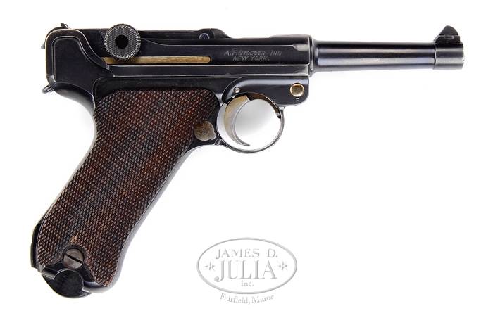 *FINE A.F. STOEGER AMERICAN EAGLE LUGER. SN 7306. Cal. 30 LUGER. Standard 3-7/8″ tapered bbl made by DWM for A.F. Stoeger Inc. of New York with spread winged American eagle over chamber area. The “A.F. STOEGER INC., NEW YORK” stamping is along the right side of receiver. Has dark, full checkered original grips with modified, unnumbered wooden bottom magazine. Rear grip area is slotted and notched to accept a shoulder stock. CONDITION: Very fine. Bluing is 95-98% with wear on high part of sideplate and sharp edges of frame. All colored metal parts retain 90-95% of their bright straw colors. All visible serial numbered parts are matching. Mechanics are crisp. Bore is bright. 4-33514 BT90 (3,000-5,000)