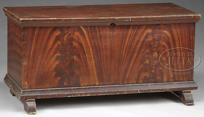 NEW YORK GRAIN PAINTED SHOEFOOT BLANKET CHEST. First quarter 19th century. Rectangular cove molded hinged lid fitted to a conforming dovetailed case. The lid opening to an interior with open till. Case with cove molded base and raised on shoe feet. Unusual form. SIZE: 20-1/2″ h x 41-1/2″ l x 18-1/2″ d. CONDITION: Very nice original condition with original umber painted surfaces. Top showing normal and expected wear. 9-22096 (600-1,000)