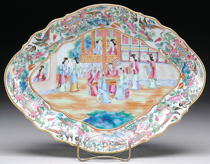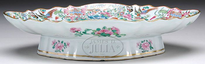 CHINESE EXPORT OVAL SERVING DISH. Mid 19th century, China. Of lobated form, the center polychrome decorated with Mandarins at a meal served by attendants, all within a densely decorated border of exotic birds and butterflies amidst vegetation. Underside decorated with floral sprigs of chrysanthemums on a raised foot. SIZE: 3″ h x 14″ l x 10-1/2″ w. CONDITION: Very good. 9-26617 (1,000-1,500)