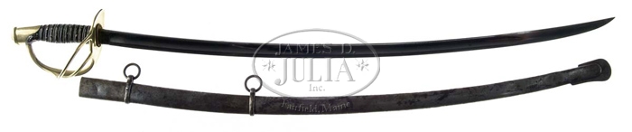 LOT OF TWO AMES SWORDS. 1) 34-3/4” dbl fuller blade. Marked with the Ames banner on the left ricasso and “US /J.C.W / 1865” on the right. The hilt and pommel are unmarked. The scabbard is missing the throat and is of lap braze construction with a brass line showing almost the full length. CONDITION: Blade is bright with only minor pitting. Guard has numerous small dents. Grip is badly chipped but most of the leather is intact. Scabbard has moderate pitting with several dents towards the tip. 2) 34-1/2” dbl fuller blade marked “AMES MFGCO /CHICOPEE /MASS.” on the left ricasso & “U.S. /D.R / 1863” on the right. The guard and pommel are not marked. The scabbard has “J.C.W.” on the drag. CONDITION: Gray patina with scattered surface rust with light pitting on the blade. Dark patina on the guard and pommel. About 20% of the leather covering is worn away. Wire wrap is slightly loose. Scabbard has light to moderate surface rust and pitting overall with numerous small dents. 4-57403, 4-57404 (1,600-2,000))
