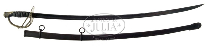 LOT OF TWO SWORDS. 1) Ames Cavalry Saber. 34-3/4” dbl fuller blade marked “Made by / AMES MFGCO /CHICOPEE / MASS” on the left ricasso, and “US /J.H. /1861” on the right. The guard is numbered “125” as is the pommel. The scabbard is numbered “68”. CONDITION: Bright gray condition on the blade. Dark patina on the guard. Leather wrap is chipped and repaired. Scabbard has a brown patina with light pitting overall. 2) Emerson & Silver Cavalry Saber. 34-1/2” dbl fuller blade marked “EMERSON /& /SILVER /TRENTON /N.J.” on the left ricasso. “US /J.F /1865” on the right. There are many numbers stamped on the pommel, some of them several times. The scabbard also has several numbers and is missing the throat screw. CONDITION: Gray patina with light pitting with small nicks in the blade. Guard and pommel are badly dented. Scabbard appears to be reblued and has numerous dents. 4-57378, 4-57406 FS242 (800-1,200)
