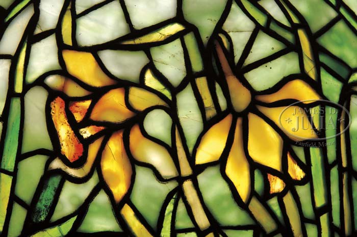 TIFFANY STUDIOS DAFFODIL TABLE LAMP. Very nice Tiffany Studios table lamp has daffodil shade with nice yellow daffodils with flashes of red in the center. Daffodils have green stems and long, slender leaves all set against a shaded cream to green background. Shade rests on a nice torpedo base with three arm spider, finished in medium brown patina with heavy green highlights. Shade is signed “Tiffany Studios New York”. Base is signed on the underside with Tiffany Studios logo. SIZE: Shade is 16″ dia. Lamp is 22″ t. CONDITION: Very good to excellent with some minor wear to patina on base. Slip cap is replacement. 5-63663 (25,000-35,000)
