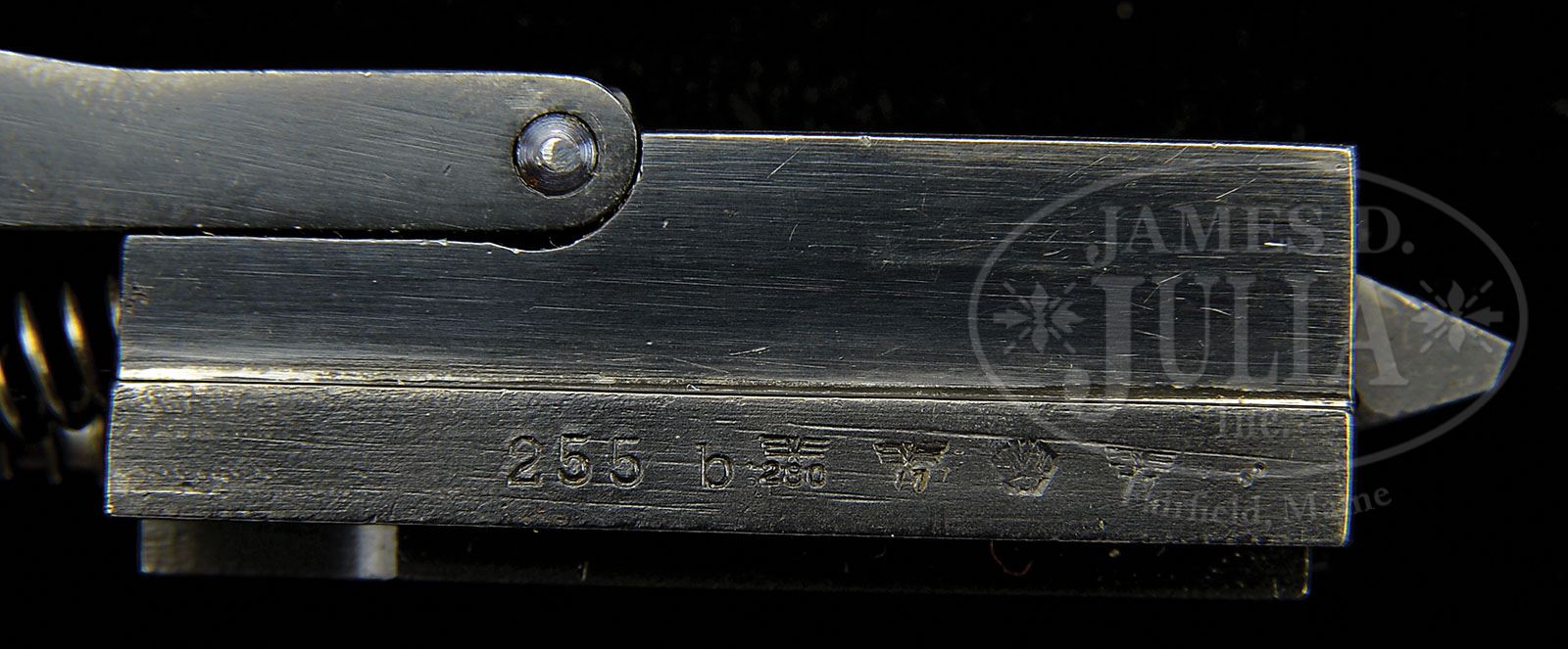 *◊ ERMA LARGE BOX S.E.L.f.P.08 22 CAL. CONVERSION SET. SN 255b. Large wood box marked Eagle/”WaA132″ on the left side lower left corner. Toggle assembly is numbered 255b with Eagle/280 and Eagle/77 WaA marked. Rear block also has circle “EE” ERMA logo. Matching numbered bbl is Eagle/77 WaA marked and bore gauge marked “5,39 m/m”. “RK” stamped rod. Brush is included, threaded brass end is missing. 5-shot magazine #332. Circle “K” and Eagle/88 proofed guide. A picture of the serial number from this set is featured on p. 1397 of Dr. Geoffrey Sturgess’ The Borchardt & Luger Automatic Pistols. PROVENANCE: Collection of Dr. Geoffrey Sturgess. CONDITION: Very fine. Wood box has moderate wear on the outside with some minor chips and dings on corners and edges. Toggle assembly retains about 98% orig blue. Accessories are in excellent original condition. 4-52385 BWS105 (2,000-3,000)