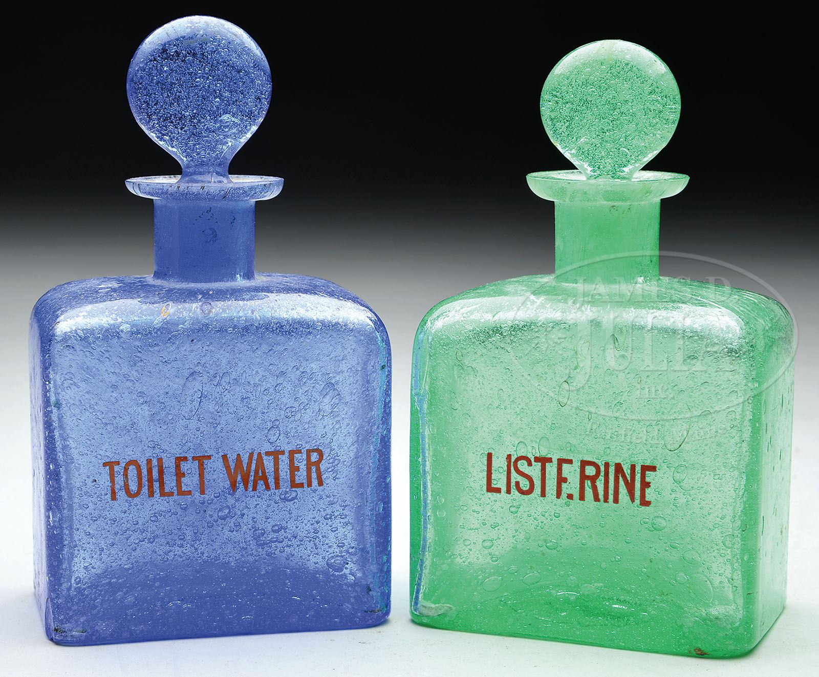 LOT OF TWO DISPLAY BOTTLES. A nice pair of barbershop or drugstore back bar bottles with frosted ice chip glass finish in seafoam green and cobalt blue lettered “Listerine” and “Toilet Water”. Fitted with their original ground stoppers, they would display beautifully on a shelf. SIZE: 5-1/2″ h. CONDITION: Some minor loss to lettered decals, otherwise very good to near excellent. 1-13383 (100-200)