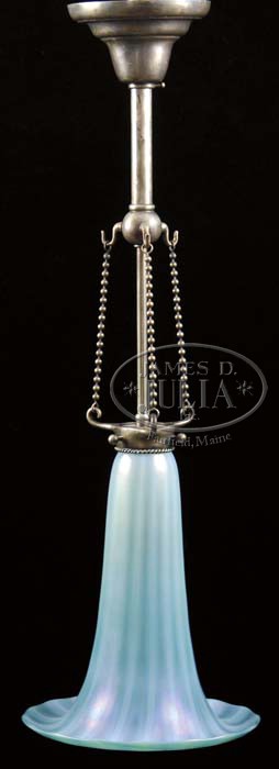 TIFFANY PENDANT LAMP. Wonderful Tiffany hanging pendant lamp features beautiful green shade with rolled lip and vertical coloration lines with light iridescence showing flashes of green and purple. Shade is suspended by three chains attaching it to the single arm pendant drop. Hardware is finished in an unusual silver patina. SIZE: Shade is 11″ t. Approx. 27-1/2″ l overall. CONDITION: Very good to excellent with some minor discoloration to patina. 5-61997 (2,500-3,500)