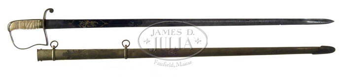 AMERICAN MILITIA ARTILLERY OFFICERS SWORD. This sword has a 32” long sgl edged straight blade with wide stopped fuller. The blade is unmarked, has an engraved blued and gilded decoration across 20% of its face on both sides. The engraved decoration is a simple stand of arms and a flag in a scrollwork panel. The hilt has a sgl branch knuckle bow shaped similar to a “P” with a bird’s head pommel and back strap of cast brass terminating at a ferrule at the base of the grip. Grip is of carved ivory with three wide bands of diagonal strips and a leaf decoration. Scabbard is of brass, heavily engraved on one face with acanthus leaves in a panel and a large oval cartouche having a liberty cap posted at the top of a pole. Most likely of European manufacture for the American market. CONDITION: Good. Blade is rusty near the ricasso. Approx. 30% of the blued finish is worn away with a couple small areas of heavy pitting and light surface rust near the tip. Knuckle bow and quillon are bent slightly downward. Grip is very good with minor chipping at the top. Sscabbard is fine, uncleaned with one minor dent on the backside below the middle mount. 4-57236 (1,000-2,000)