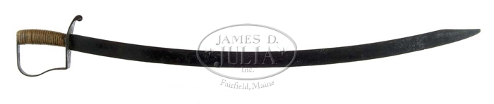 ALTERED STAR CONTRACT CAVALRY SABER. An altered version of the Star Contract 1812-1813 cavalry saber in relic condition. The 33-1/2” blade is wide, flat, and curved with a sgl edge. The hilt is 1-pc iron with a P-shaped knuckle bow. The orig grip has been replaced with a series of leather washers. The blade is stamped “P/HHP” on one face near the hilt. All other markings have been obliterated by pitting. CONDITION: Rough condition sword, dark and uncleaned with heavy pitting overall. Hilt appears to have been painted silver at some point and the grip has been entirely replaced. 4-57337 CW99 (200-300)