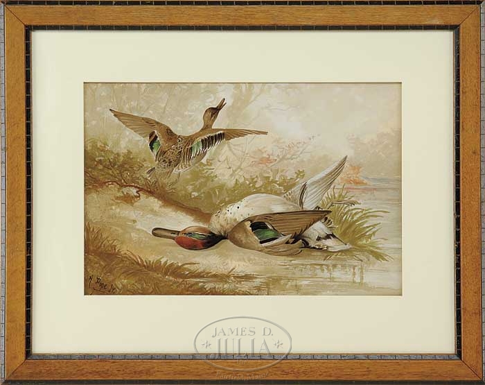 AFTER ALEXANDER POPE JR. (American, 1849-1924) PAIR OF DUCK CHROMOLITHOGRAPHS. Identically housed in period oak and ebonized frames with replaced white mattes. The chromolithographs after paintings by Pope, one showing a dead duck on riverbank with another flying away. The other shows male and female ducks on water. SIZE: Sight: 13″ x 19-1/4″. CONDITION: Generally very good with some light water stains. 9-20128 (300-500)
