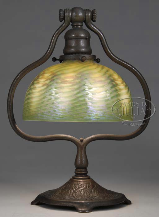 TIFFANY ZODIAC DESK LAMP. Nice Tiffany desk lamp has harp base with zodiac pattern impressed around the foot and a rich brown patina. Base supports a nice green damascene shade with platinum iridescent highlights. Shade is signed on the fitter rim “LCT Favrile”. Base is signed “Tiffany Studios New York 661”. SIZE: Shade is 7-1/8″ dia. Lamp is 12-3/4″ t. CONDITION: Very good. Rewired with plastic cord, two small screws are missing from socket cover. 5-63939 (4,000-6,000)