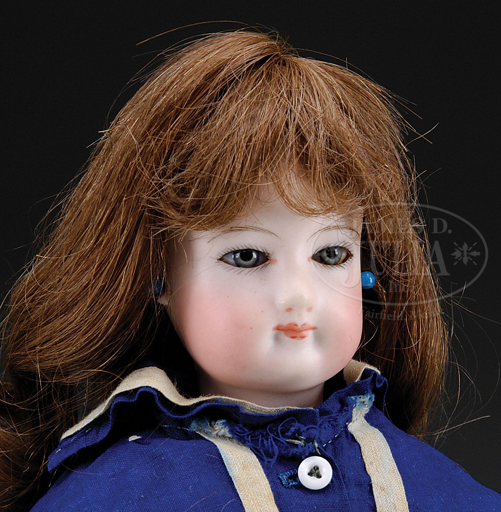 PRETTY FRENCH FASHION WITH ARTICULATED BODY. Pale bisque socket head and separate shoulder plate has blue paperweight eyes, closed slightly smiling mouth and pierced ears on kid over wood jointed body with bisque forearms. She wears a two-piece dark blue cotton dress with white braid trim, antique brown leather shoes incised “5 Paris Depose” and wears a brown human hair wig over cork pate. SIZE: 17-1/2″ (44cm). CONDITION: Overall very good; slight mold separation on right upper side of head (not a hairline crack) and slight damage to body at back of the left knee joint. 1-12394 (1,500-2,500) Auction: Advertising, Toy & Doll - Fall 2012 Please Note: All prices include the hammer price plus the buyer’s premium, which is paid by the buyer as part of the purchase price. The prices noted here after the auction are considered unofficial and do not become official until after the 46th day. |